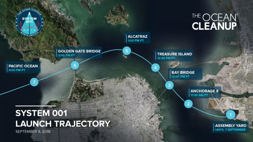 I kveld, norsk tid, vil systemet starte sin ferd fra Anchorage 9, San Francisco Bay. Det vil bli fraktet under Bay Bridge, forbi Treasure Island og Alcatraz. Under Golden Gate Bridge og videre ut mot Stillehavet hvor testingen kan begynne. Hele denne ferden kan følges på The Ocean Cleanup sine sider, hvor de også vil ha en livesending fra hele denne ruten.